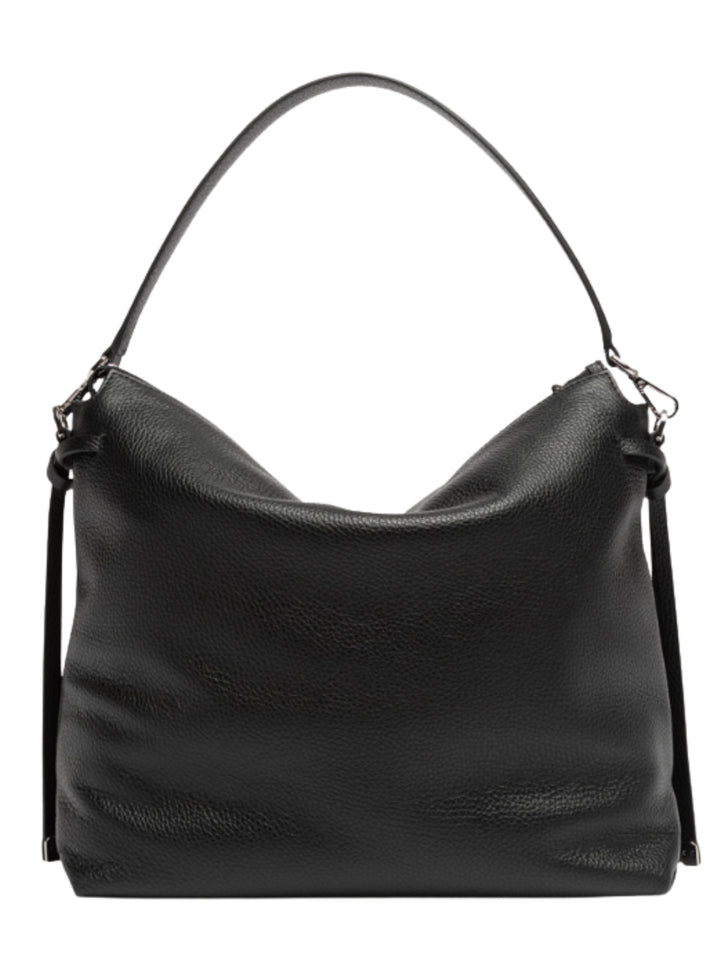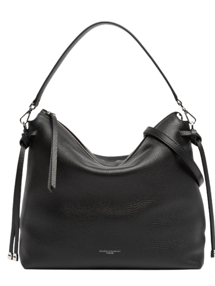 Brina by Gianni Chiarini Firenze è una borsa in pelle martellata con linee minimal e squadrate. I dettagli annodati e i componenti in metallo aggiungono un tocco luminoso. È dotata di un manico in pelle per essere indossata comodamente a spalla e di una tracolla regolabile e removibile, ideale per un'opzione crossbody. La chiusura superiore con zip garantisce sicurezza e praticità. Dimensioni: 32x28x11 cm.