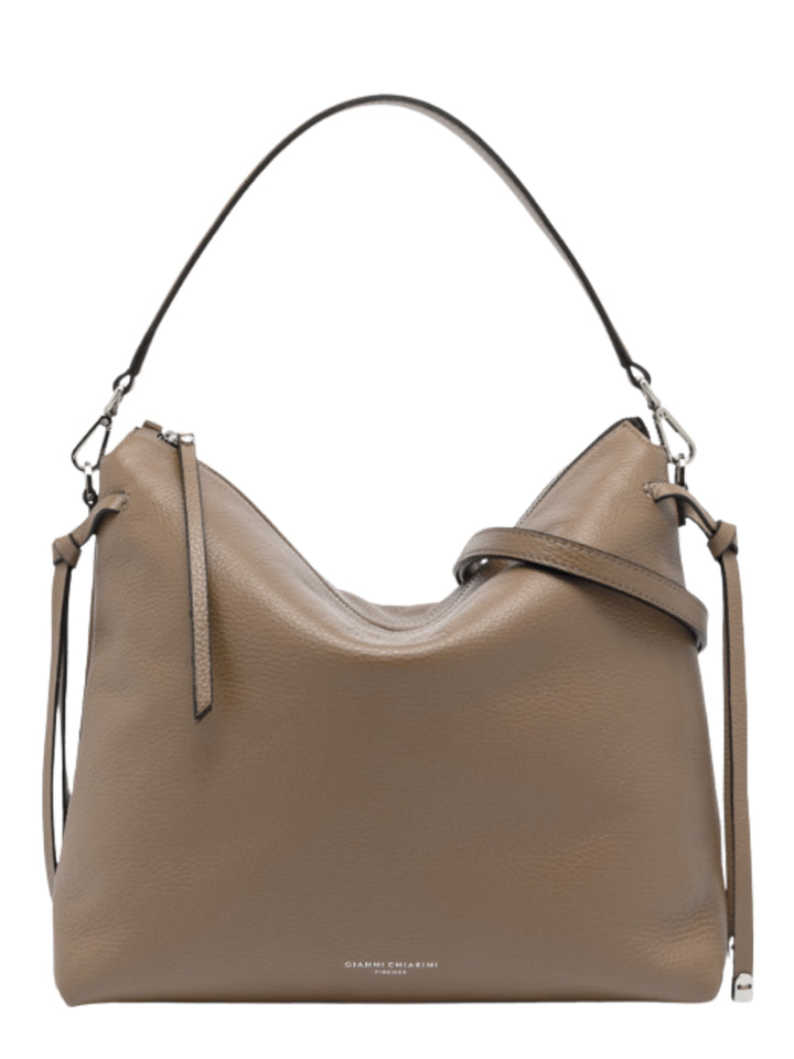 Brina by Gianni Chiarini Firenze è una borsa in pelle martellata con linee minimal e squadrate. I dettagli annodati e i componenti in metallo aggiungono un tocco luminoso. È dotata di un manico in pelle per essere indossata comodamente a spalla e di una tracolla regolabile e removibile, ideale per un'opzione crossbody. La chiusura superiore con zip garantisce sicurezza e praticità. Dimensioni: 32x28x11 cm.