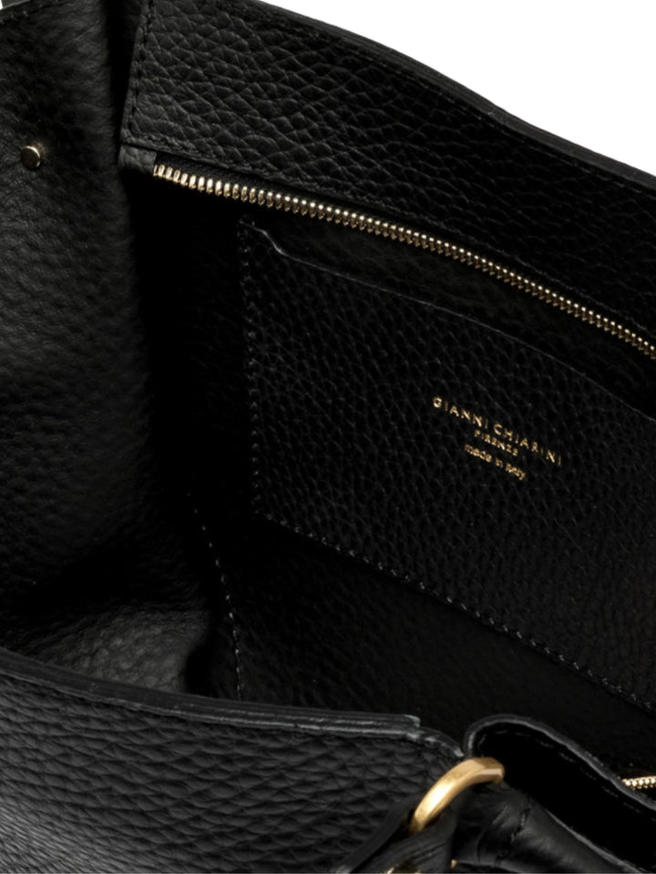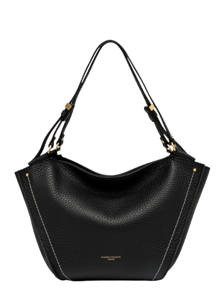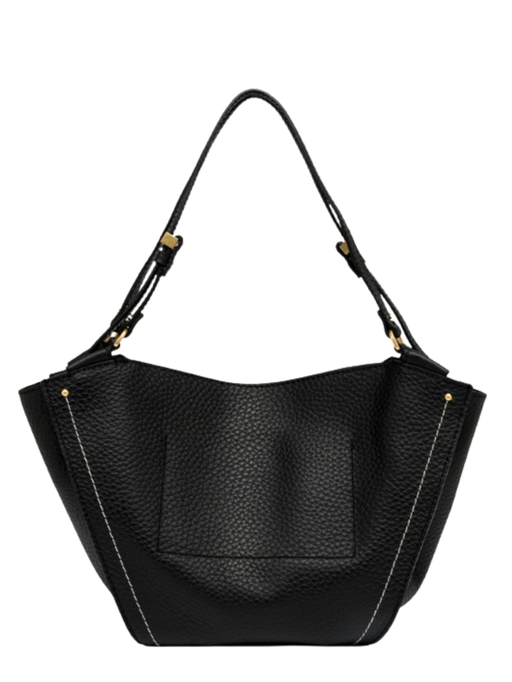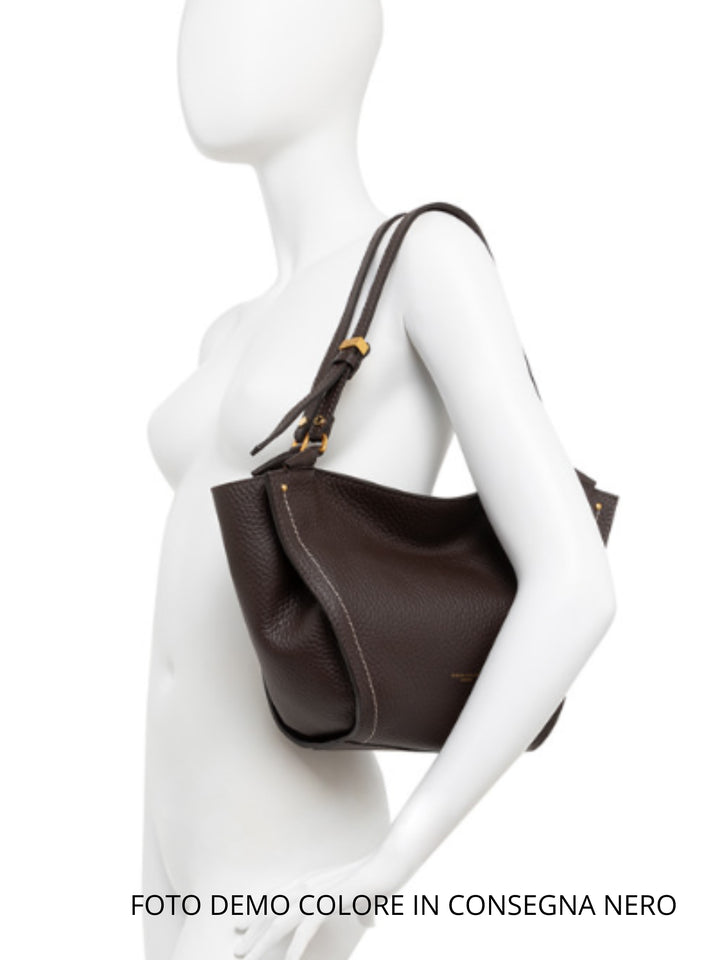Bloom è la nuova borsa pratica e capiente, caratterizzata da una shape a tulipano. Realizzata in pelle double dalla grana maxi ed impreziosita da una cucitura decorativa a contrasto. L'accessorio è arricchito da elementi in metallo che donano alla borsa un tocco di lucentezza. Dimensioni: 43x25x14 cm.