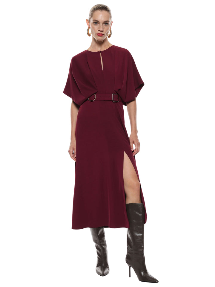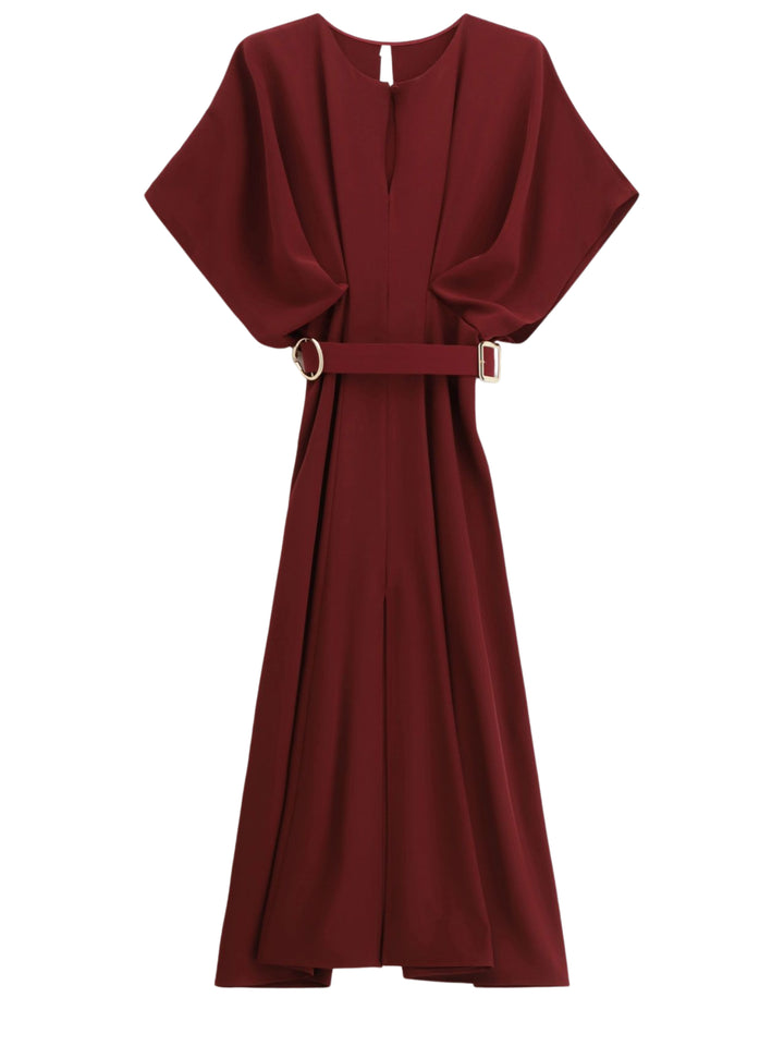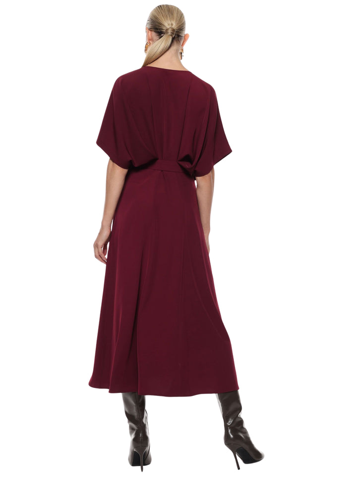 Explore our women's draped dress with batwing sleeves. The belt accentuates the silhouette, creating an elegant and modern look. Ideal for any occasion, this piece combines comfort and style.