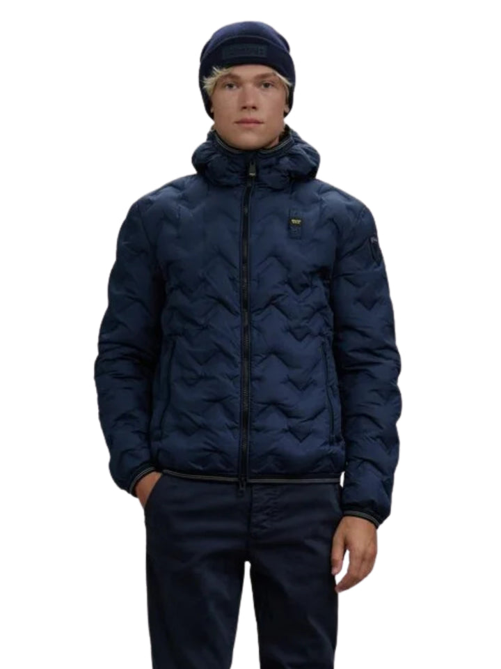 Piumino con cappuccio fisso e profilo dall’aspetto aderente e increspato. Cuciture nastrate ad angoli che dona un tocco innovativo e dinamico.