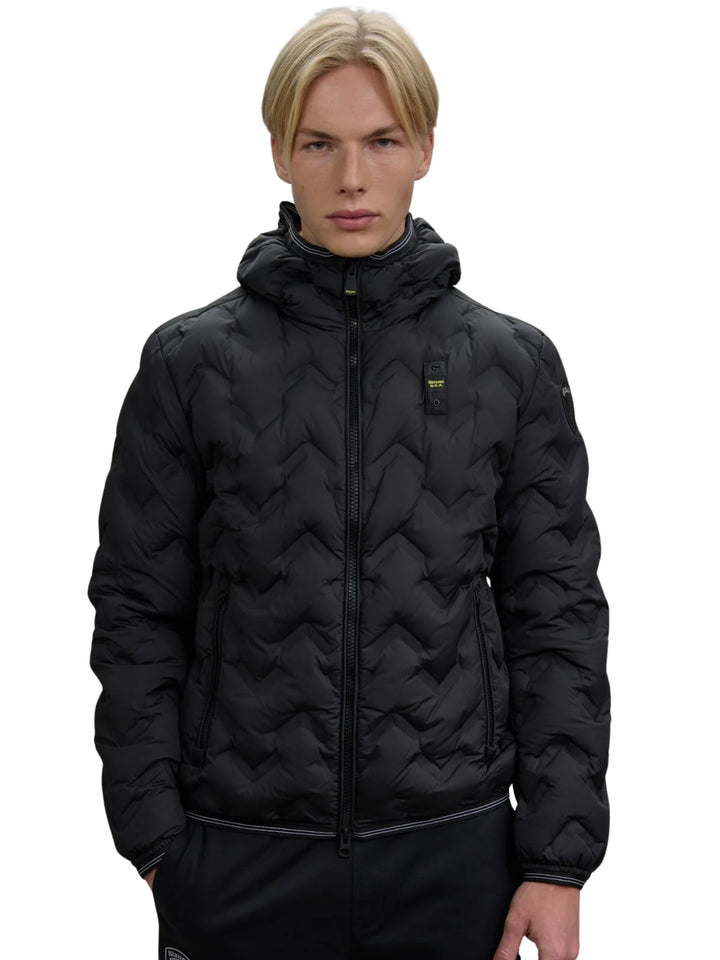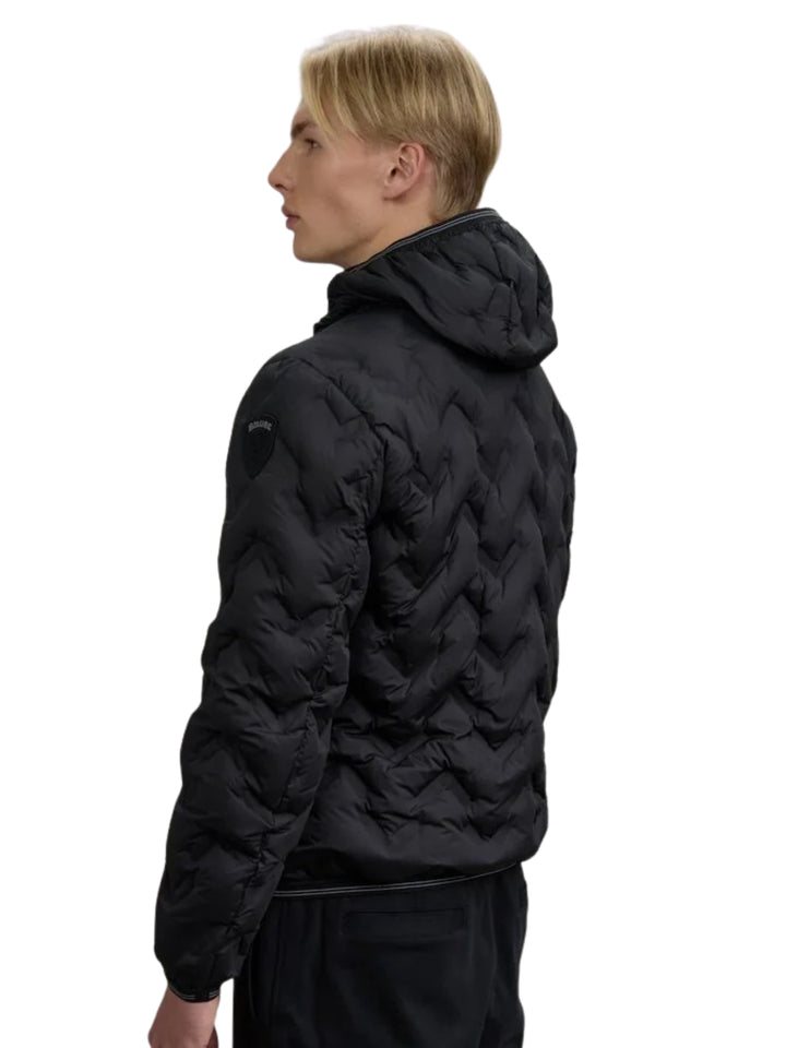 Piumino con cappuccio fisso e profilo dall’aspetto aderente e increspato. Cuciture nastrate ad angoli che dona un tocco innovativo e dinamico.