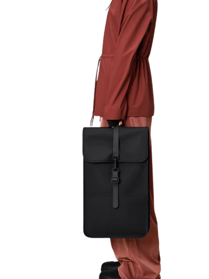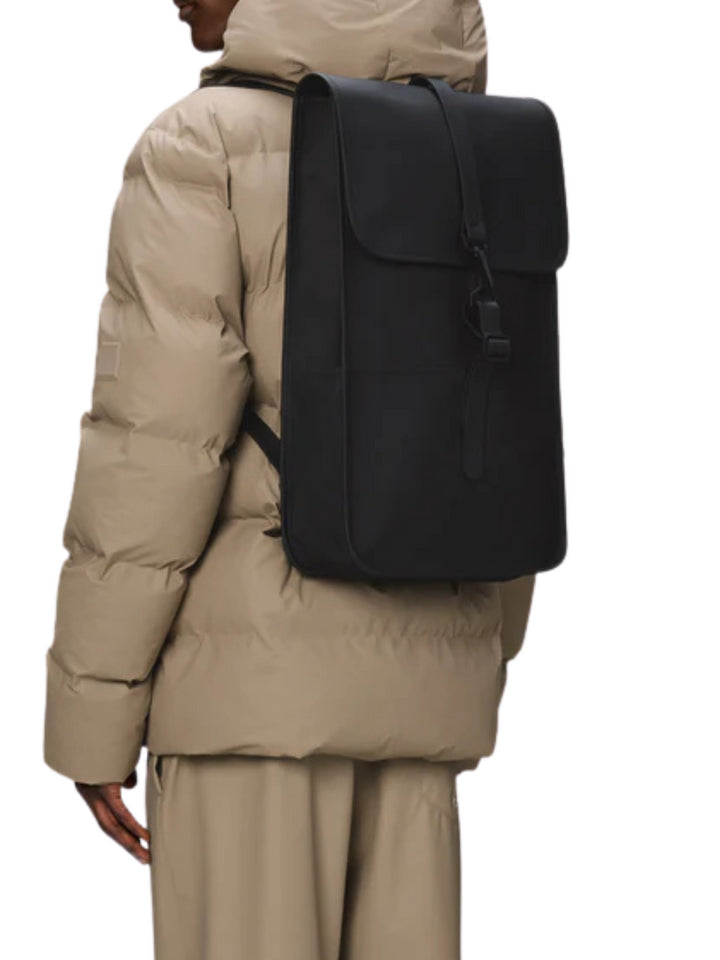 Il Backpack è realizzato nell'iconico tessuto PU di Rains, progettato per essere robusto, duraturo e piacevole al tatto.