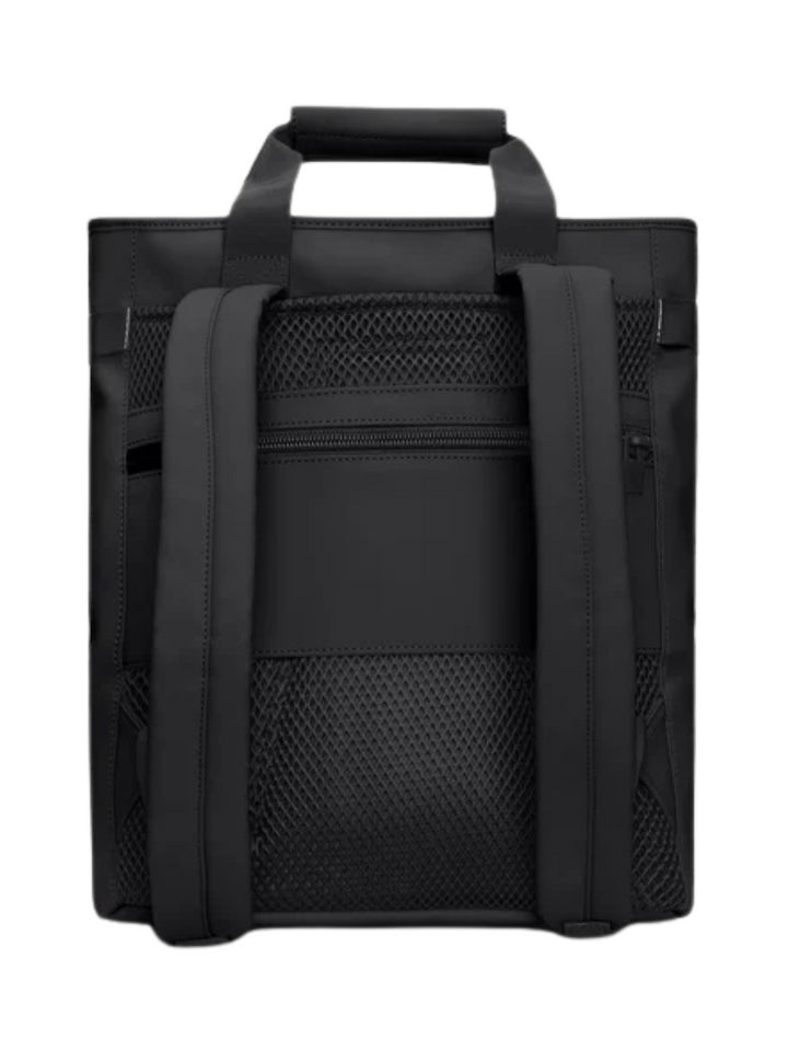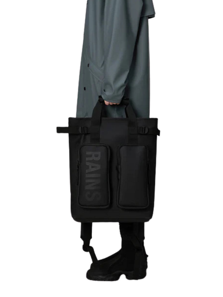 La Texel Tote Backpack è realizzata nell'iconico tessuto PU impermeabile di Rains, progettato per essere robusto, duraturo e piacevole al tatto.