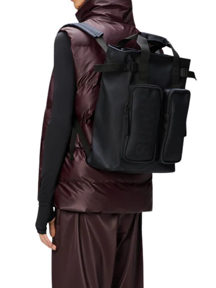 La Texel Tote Backpack è una borsa ibrida con tasca imbottita per laptop, pensata per i viaggi brevi. Il modello è realizzato nell'iconico tessuto impermeabile in PU di Rains.