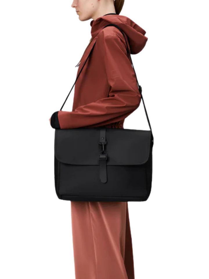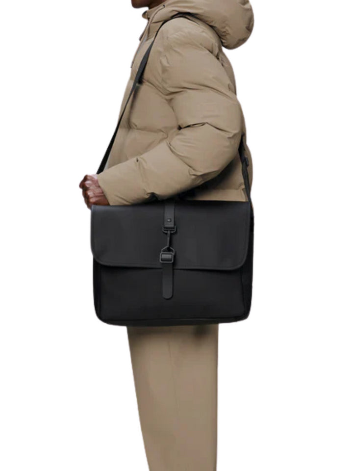La Messenger Bag è realizzata nell'iconico tessuto PU di Rains, progettato per essere robusto, duraturo e piacevole al tatto.