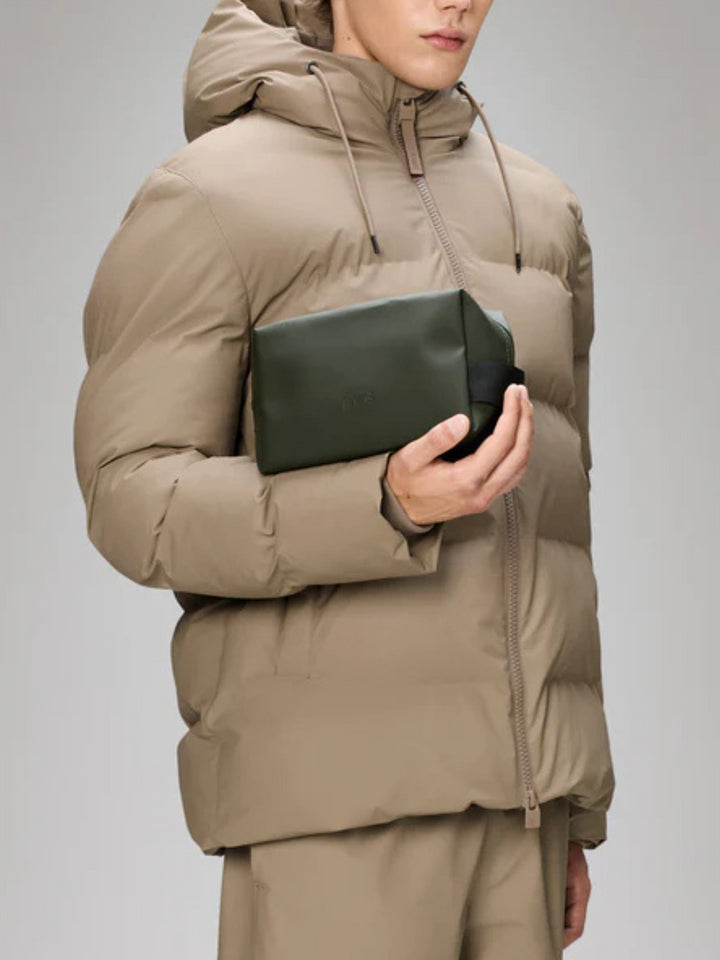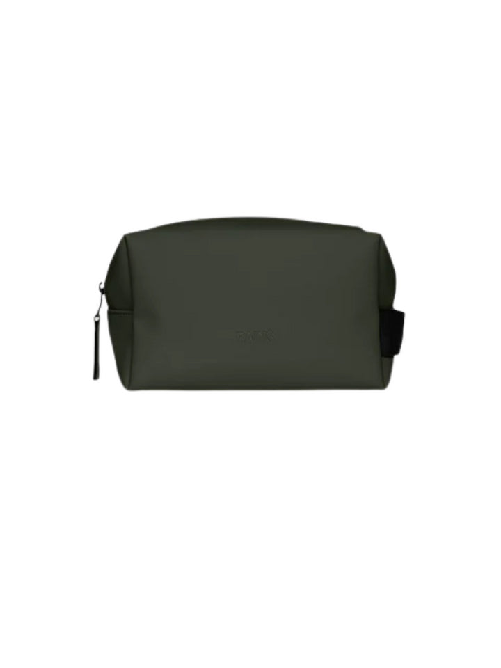 La Wash Bag Small è realizzata in tessuto PU impermeabile firmato Rains, progettato per essere robusto, duraturo e piacevole al tatto.