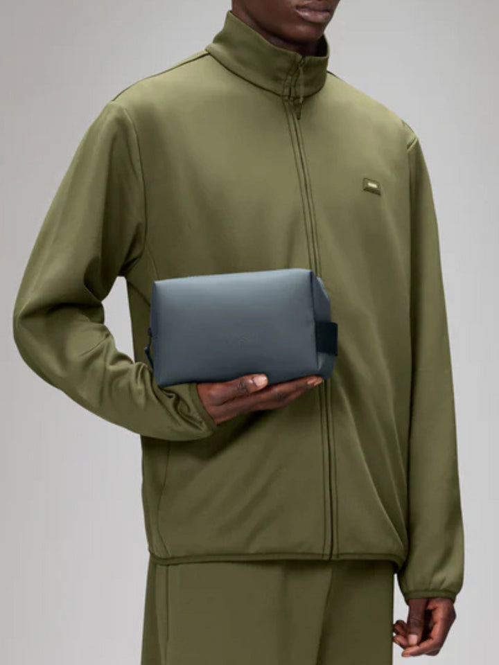 La Wash Bag Small è realizzata in tessuto PU impermeabile firmato Rains, progettato per essere robusto, duraturo e piacevole al tatto.